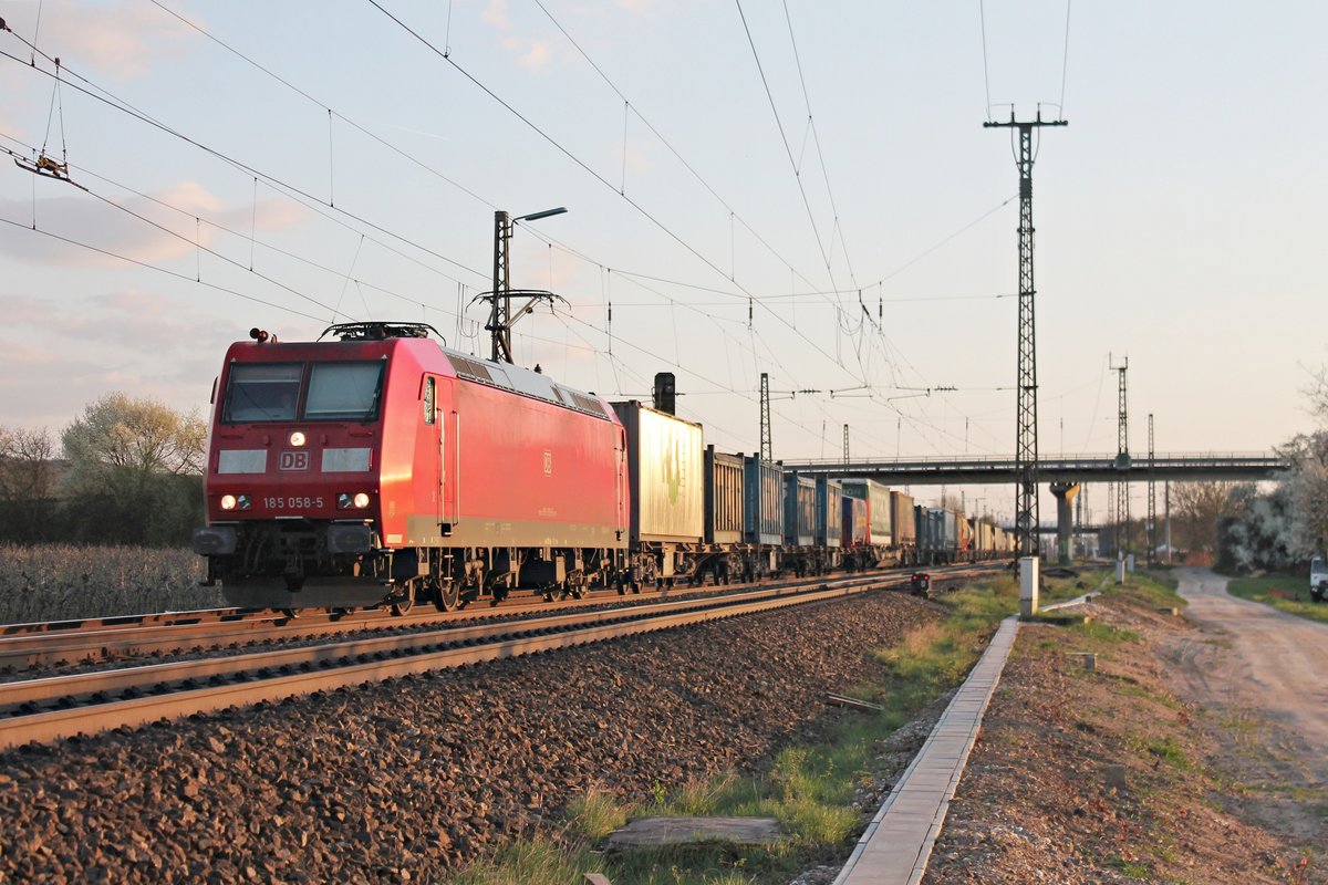 Mit einem bunten KLV fuhr am Abend des 28.03.2017 die 185 058-5 durch den Bahnhof von Müllheim (Baden) in Richtung Freiburg (Breisgau) auf der KBS 703 durchs Markgräflerland.