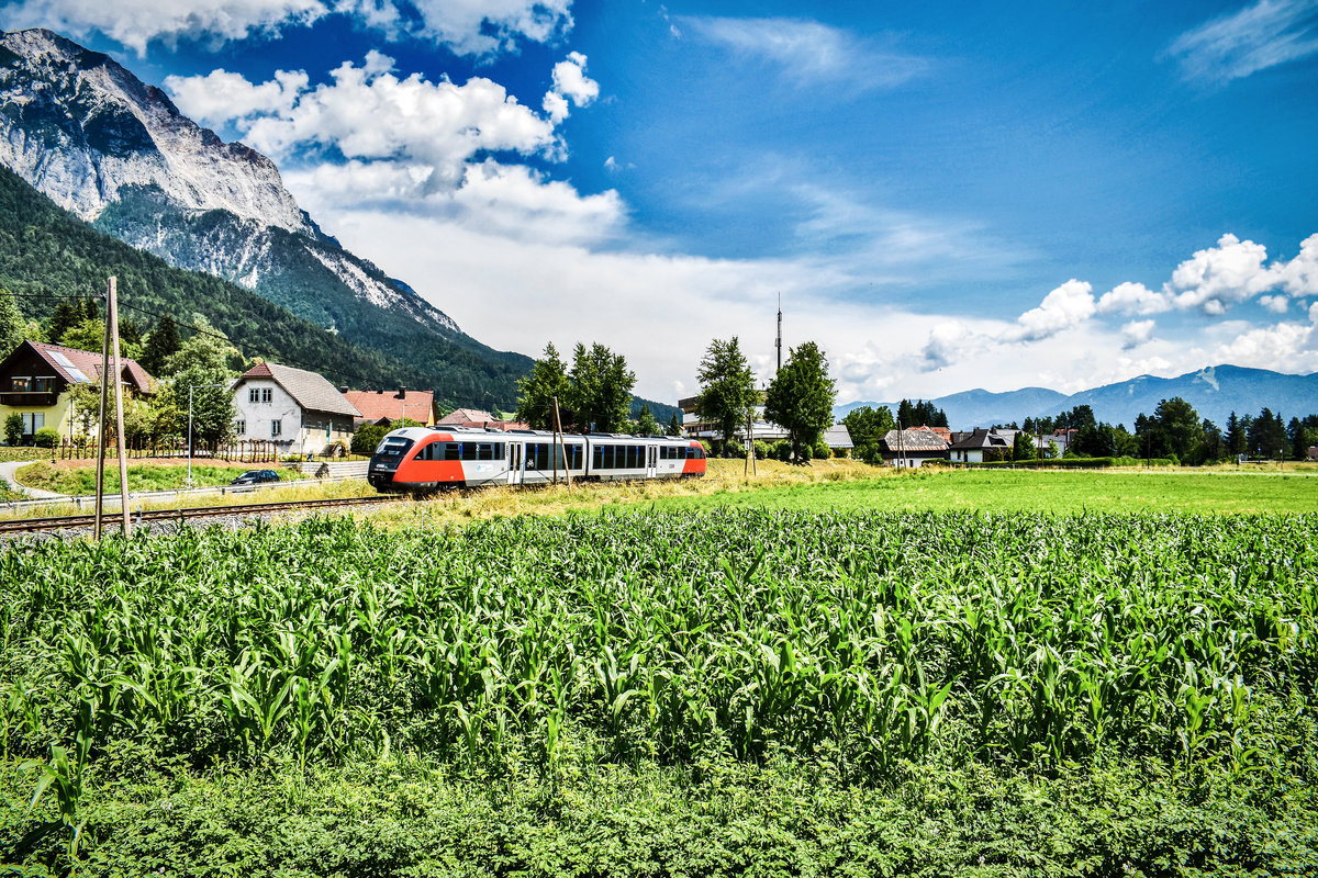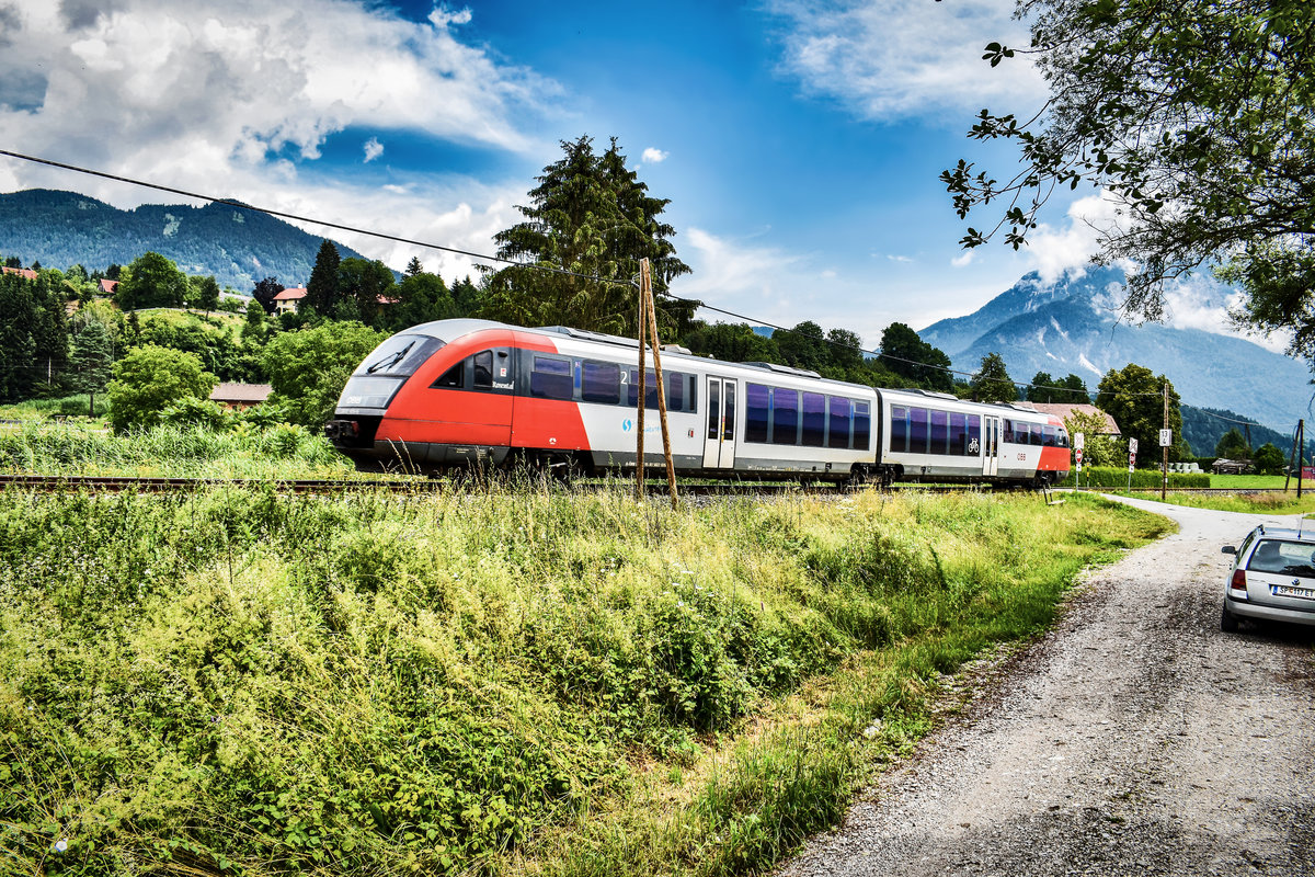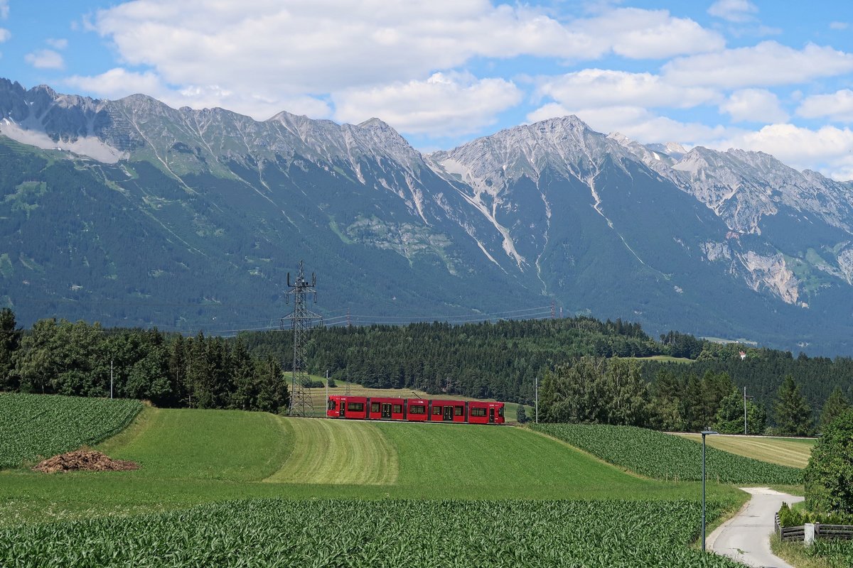 Tw. 3xx der Stubaitalbahn zwischen den Haltestellen Mutters und Mutters Birchfeld. Aufgenommen 16.6.2018.