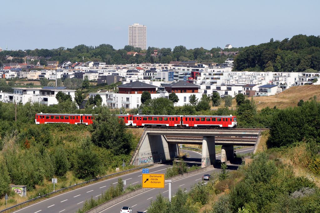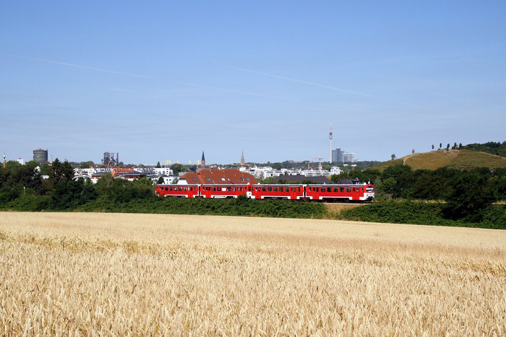 VT 2.35 und 2.37 der Ascherslebener Verkehrsgesellschaft mbH als Pendelzug zwischen den Stationen Holzwickede und Schwerte im Auftrag des ZRL bei Dortmund-Hörde mit dem Phoenix-See im Hintergrund am 08.07.2018.