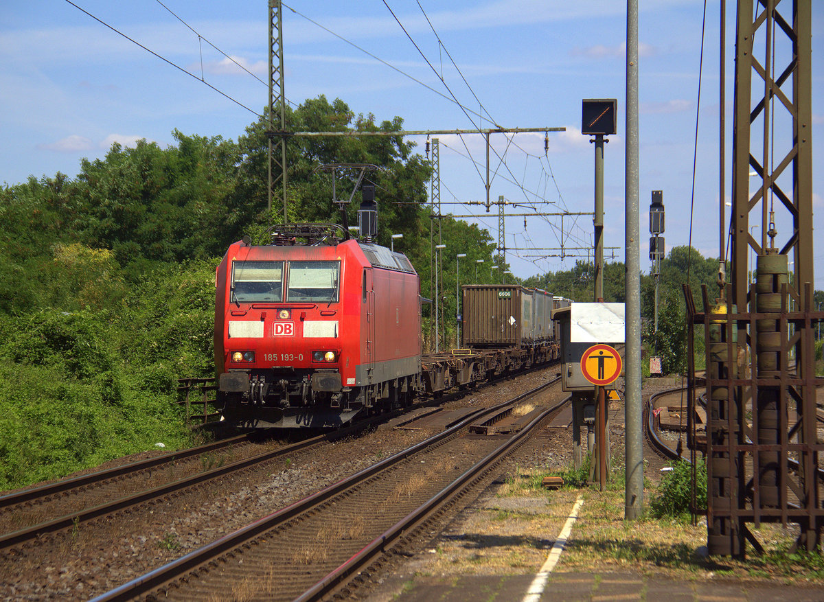 185 193-0 DB kommt als Umleiter mit einem LKW-Ambrogio-Zug aus Gallarate(I) nach Neuss-Gbf(D) und kommt aus Richtung Duisburg-Hochfeld-Süd und fährt durch Duisburg-Rheinhausen-Ost in Richtung Duisburg-Rheinhausen,Rheinhausen,Krefeld-Hohenbudberg-Chempark,Krefeld-Uerdingen,Krefeld-Linn,Krefeld-Oppum,Meerbusch,Neuss.