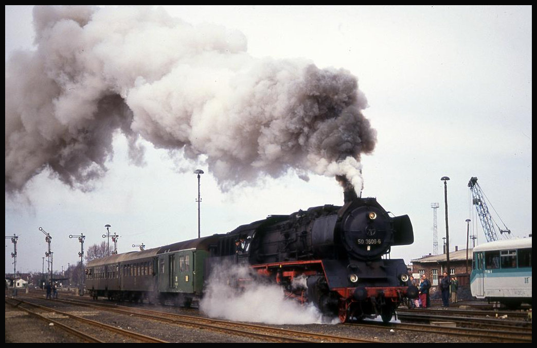 503606 setzt am 10.4.1994 im Bahnhof Oebisfelde um 16.00 Uhr vor den Personenzug nach Salzwedel.