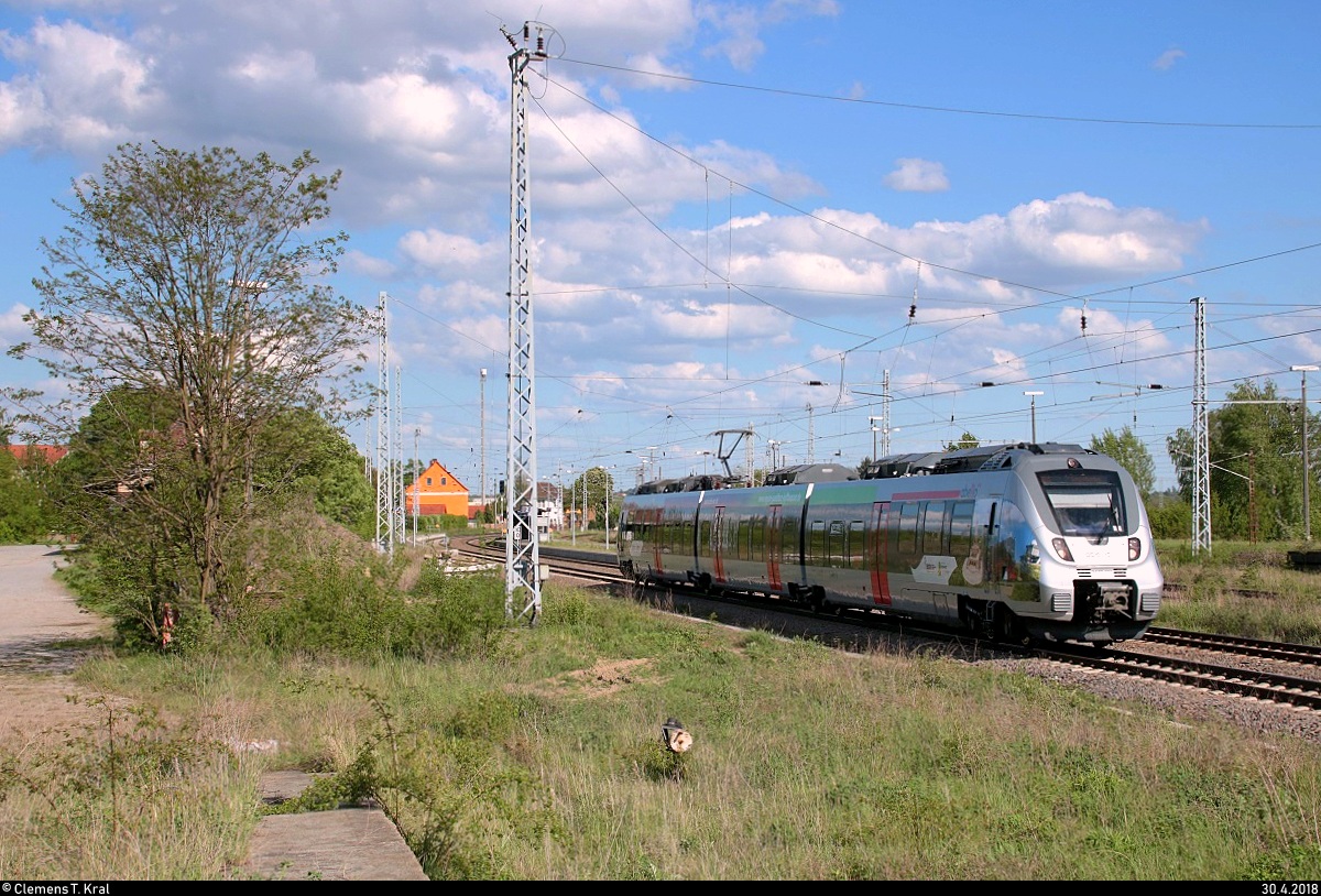 9442 112 (Bombardier Talent 2) von Abellio Rail Mitteldeutschland als RB 74784 (RB75) von Halle(Saale)Hbf nach Sangerhausen verlässt den Bahnhof Angersdorf auf der Bahnstrecke Halle–Hann. Münden (KBS 590). Aufnahmestandort öffentlich zugänglich. [30.4.2018 | 16:49 Uhr]