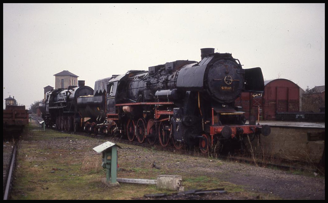Abgestellte Schrottlok 528001 vor Dampfspender am 10.4.1994 im BW Oebisfelde.