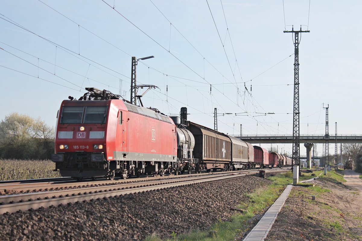 Am 29.03.2017 bespannte 185 113-8 einen gemischten Güterzug (Chiasso - Mannheim Rbf), als sie durch die Überholgleise von Müllheim (Baden) in Richtung Norden fuhr.