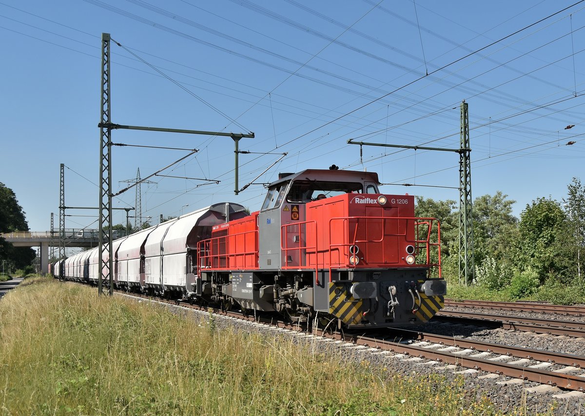 Am Dienstag den 3.7.2018 kommt die Railflex 1275 614-2 mit einem Kalkwagenzug durch Lintorf gen Ratingen gefahren.