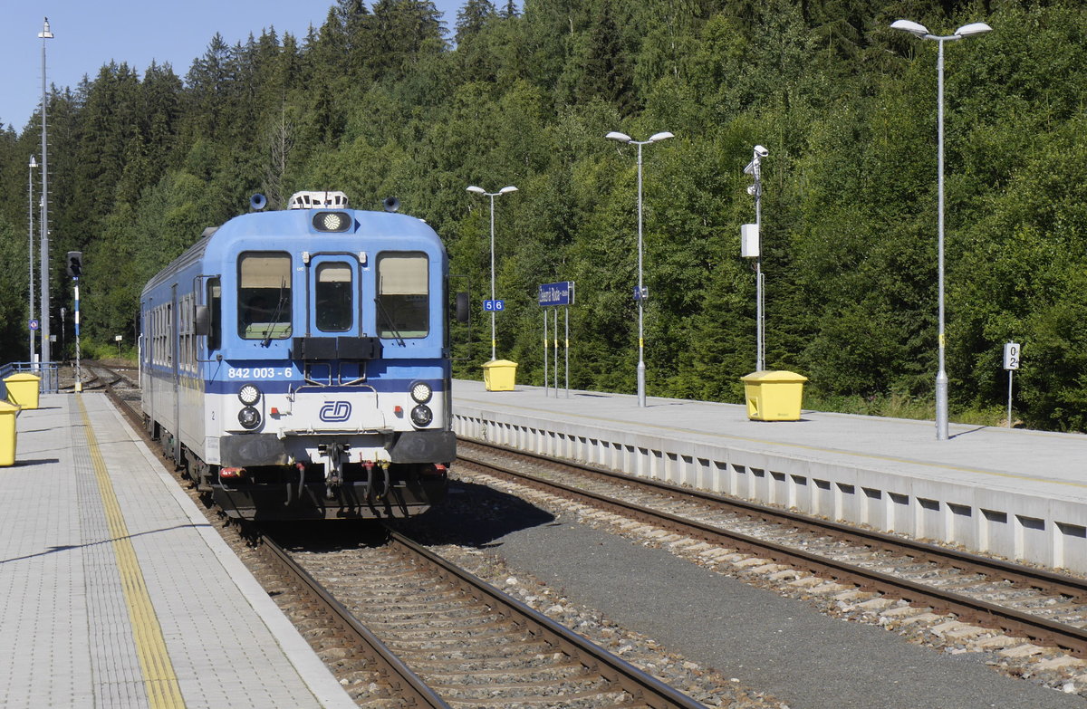 CD-Triebwagen 842 003 fährt als Regionalzug Os 7544 von Klatovy in Zelezna Ruda ein (tschechischer Teil des Bf Bayerisch Eisenstein), 2.7.18.