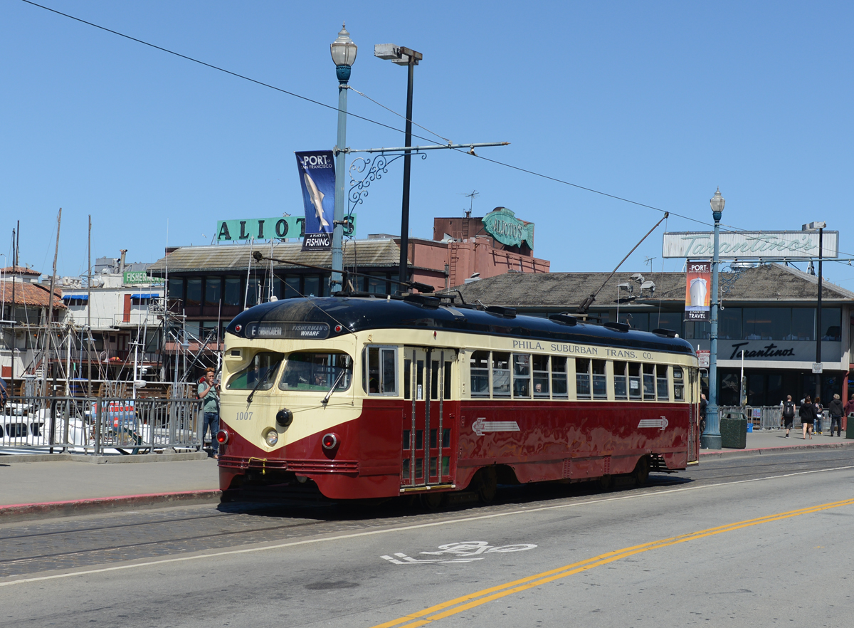 Der für die Philadelphia Suburban Transportation Co. 1948 beschaffte PCC-Wagen 1007 "Red Arrow" hat am Nachmittag des 27. April 2016 das berühmte Vergnügungsviertel "Fisherman’s Wharf" soeben erreicht und wird nach der Wende in der Jones Street die Fahrt zurück nach Castro antreten.
