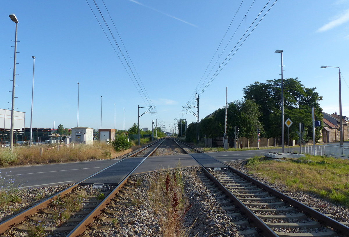 399 611-3 quert auf ihrer Rundfahrt den ungesicherten Bahnübergang am Baschkirischen Spielplatz der Peißnitzinsel. [1.4.2018 | 14:06 Uhr]