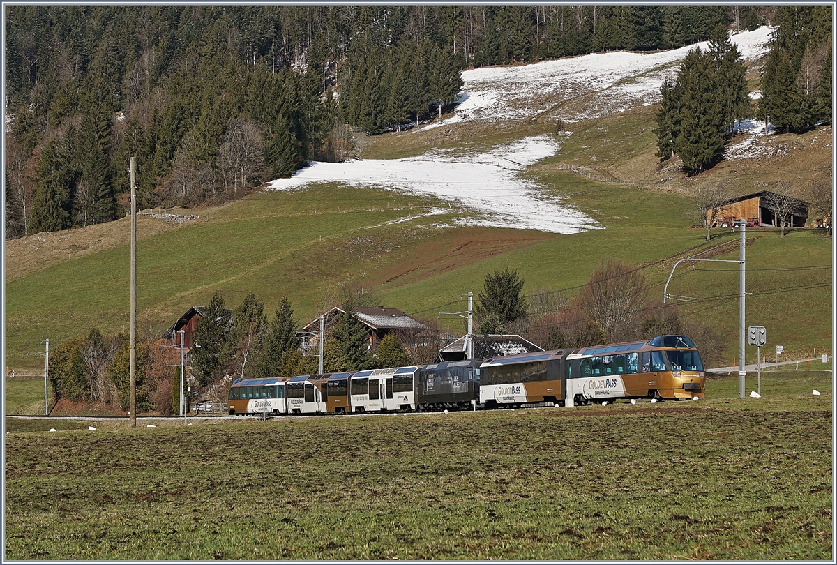Die MOB Ge4/4 8003 ist mit einem MOB Panoramic Express bei Flendruz unterwegs.