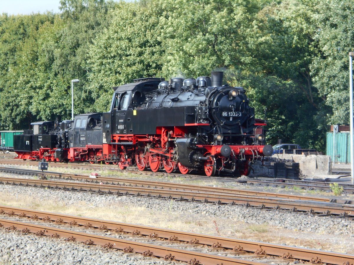 Gegen 18:00 Uhr hatte 86 1333,am 08.Juli 2018,ihr Tagessoll auf der KBS 198 erreicht und dampfte zum Feierabend an den Kohlebansen in Putbus.Aufnahme von der dortigen Tankstelle aus.