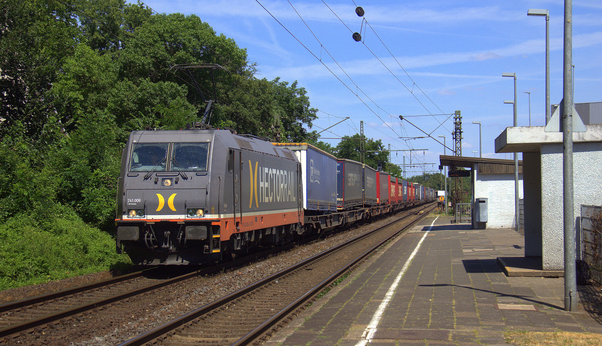 Hectorrail 241.006 "Carlrissian" kommt mit einem LKW-Zug aus Süden nach Krefeld-Uerdingen und kommt aus Richtung Duisburg-Hochfeld-Süd und fährt durch Duisburg-Rheinhausen-Ost in Richtung Duisburg-Rheinhausen,Rheinhausen,Krefeld.