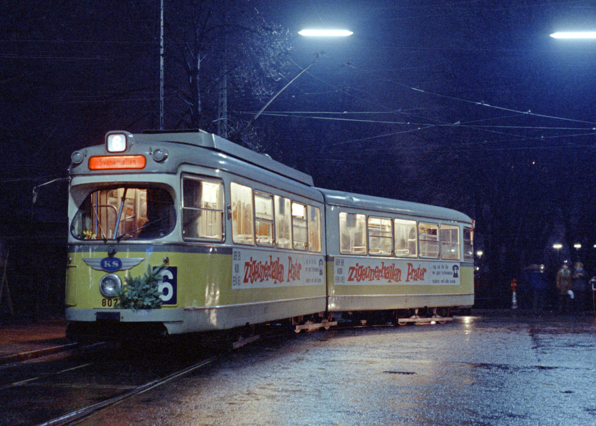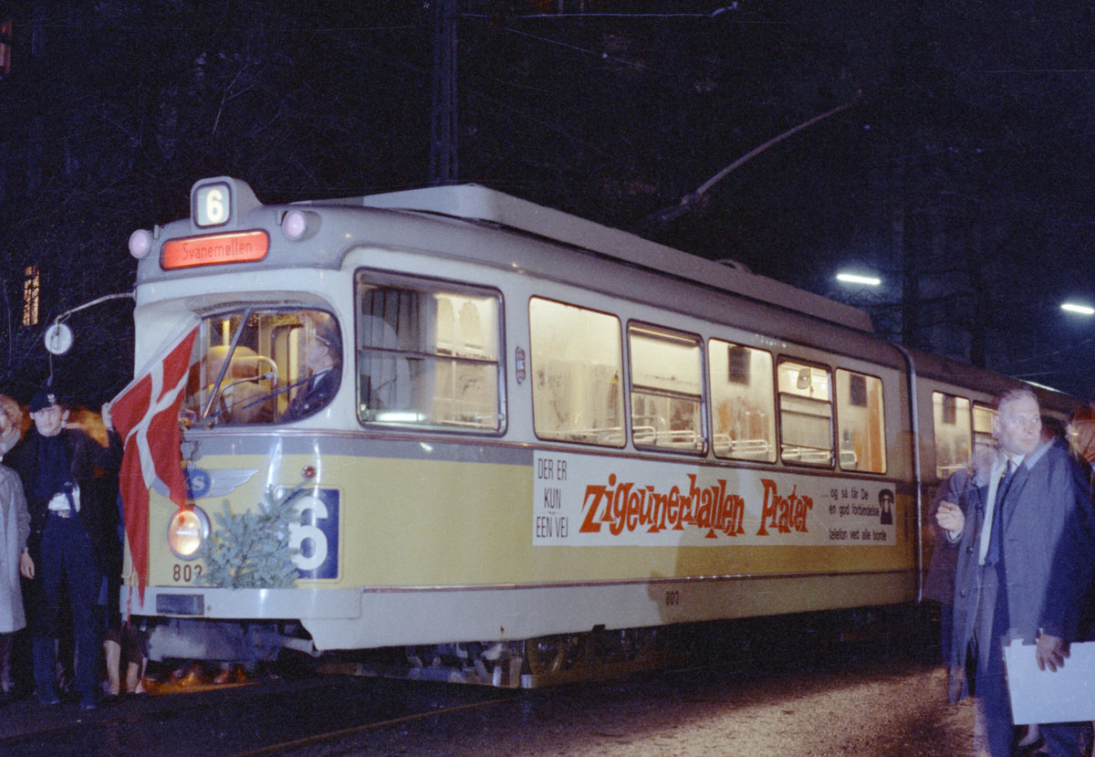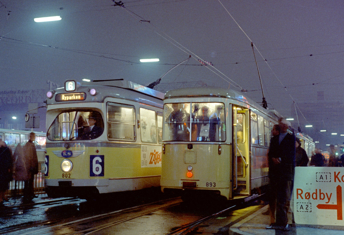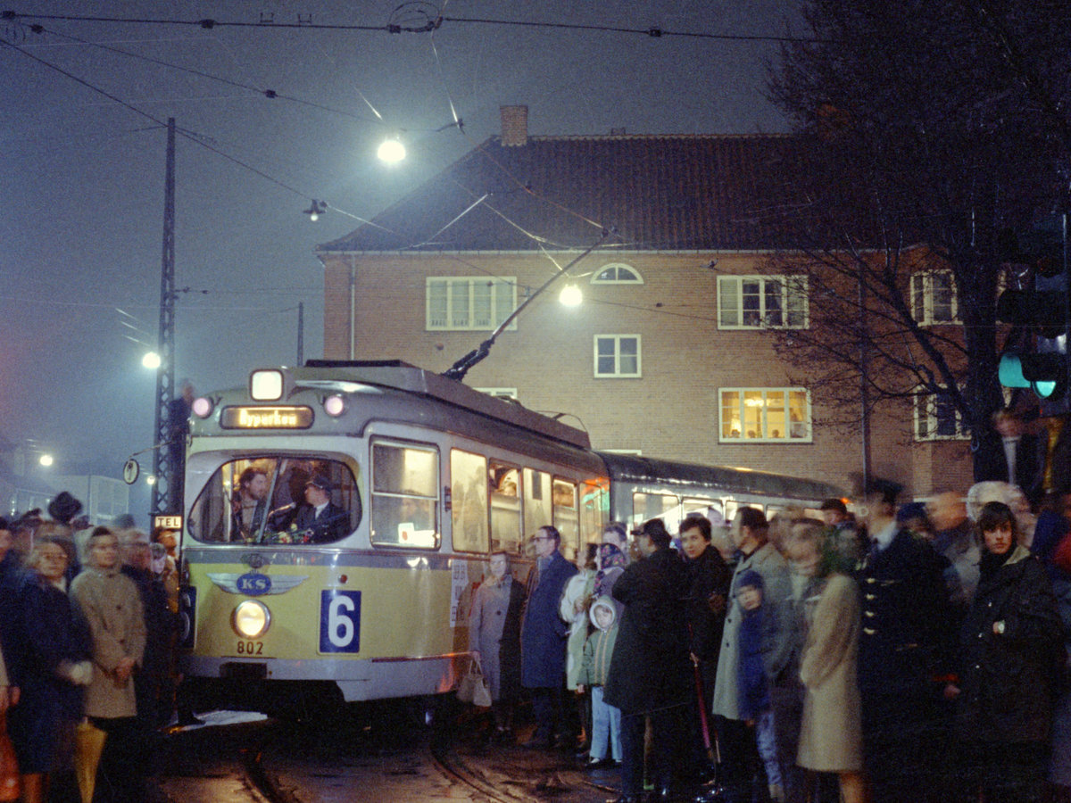 København / Kopenhagen Københavns Sporveje: Stillegung der SL 6. - Um Mitternacht in der Nacht vom Samstag dem 26. auf den Sonntag den 27. April 1969 stand der DÜWAG/Kiepe-GT6 802 in der Endstation Ålholm Platz (im Stadtteil Valby) als letzter Zug in Richtung Ryparken (im Stadtteil Østerbro). - Am anderen Ende der SL 6, in der Endstation Ryparken, stand zur gleichen Zeit der GT6 893 zur Abfahrt in Richtung Ålholm Platz bereit. Die beiden Züge würden sich am Kopenhagener Rathausplatz um 0:30 Uhr treffen. - Viele Schaulustige und Straßenbahnfreunde wollten die letzte Abfahrt der beliebten Linie erleben, was das Fotografieren nicht leichter machte. - Scan eines Farbnegativs. Film: Kodak Kodacolor X.
