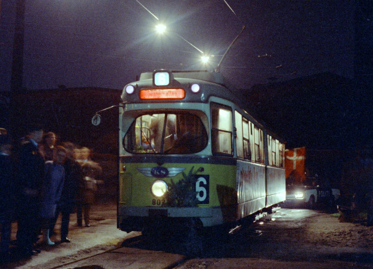 København / Kopenhagen Københavns Sporveje: Stillegung der SL 6. - Zeit: Um 01:00 in der Nacht vom Samstag dem 26. auf den 27. April 1969. - Der letzte Zug in Richtung Ryparken, der DÜWAG/Kiepe-GT6 802, hat die Endstation erreicht. Nach einem kurzen Aufenthalt wird der Zug in den Straßenbahnbetriebsbahnhof Svanemøllen einziehen. - Scan eines Farbnegativs. Film: Kodak Kodacolor X.