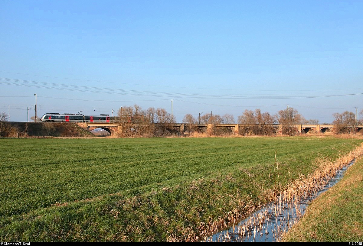 Nachschuss auf 9442 ??? (Bombardier Talent 2) von Abellio Rail Mitteldeutschland als RE 74715 (RE9) von Kassel-Wilhelmshöhe nach Halle(Saale)Hbf Gl. 13a, der in der Saaleaue bei Angersdorf auf der Bahnstrecke Halle–Hann. Münden (KBS 590) fährt. [8.4.2018 | 18:48 Uhr]