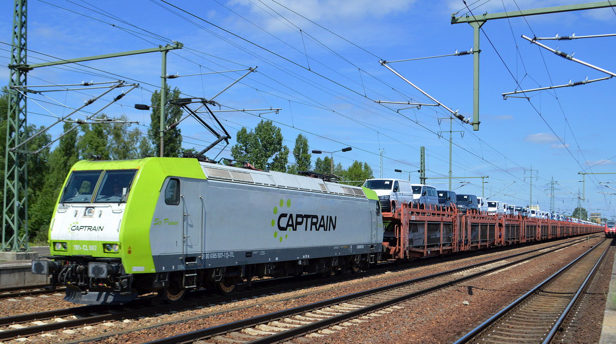 Captrain/ITL 185-Cl 007 (NVR-Number: 91 80 6185 507-1 D-ITL] und einem Transportzug mit fabrikneuen VW Nutzfahreugen aus polnischer Produktion am 12.06.18 Bf. Flughafen Berlin-Schönefeld.