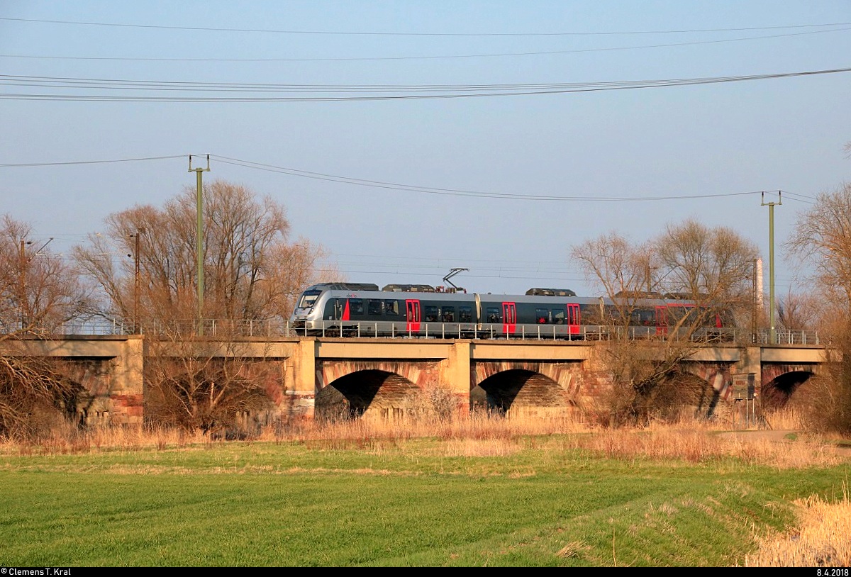 9442 ??? (Bombardier Talent 2) von Abellio Rail Mitteldeutschland als RE 74715 (RE9) von Kassel-Wilhelmshöhe nach Halle(Saale)Hbf Gl. 13a fährt in der Saaleaue bei Angersdorf auf der Bahnstrecke Halle–Hann. Münden (KBS 590). [8.4.2018 | 18:48 Uhr]