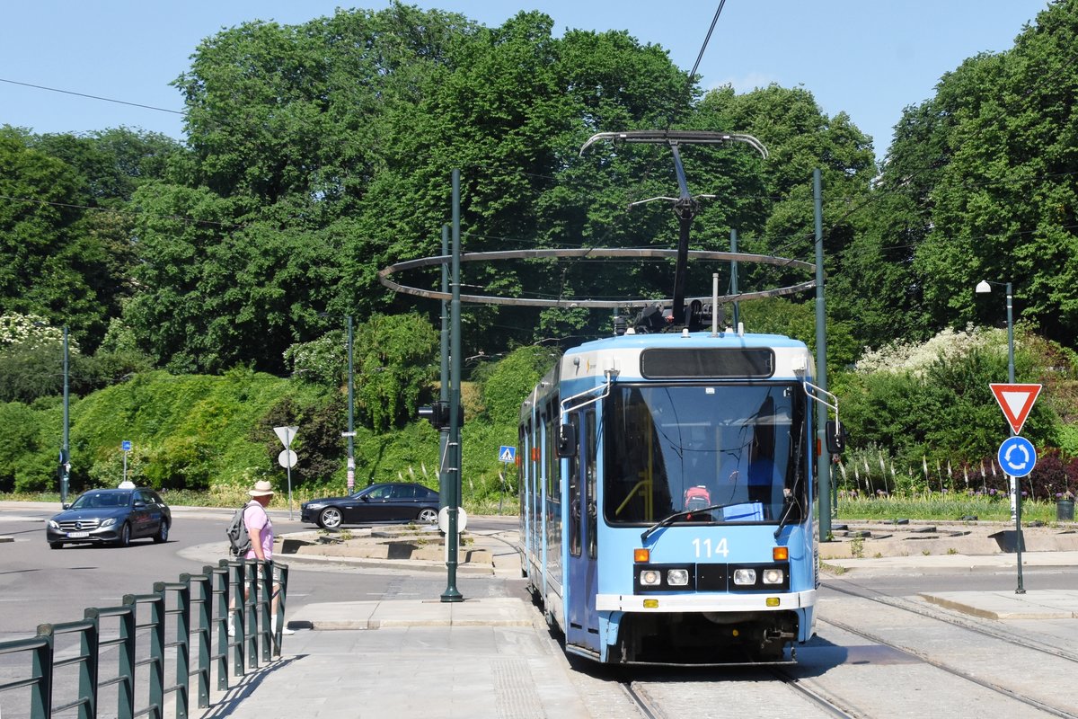 OSLO (Provinz Oslo), 02.06.2018, Wagen 114 als Tramlinie 19 nach Ljabru bei der Einfahrt in die Haltestelle Nationalteatret