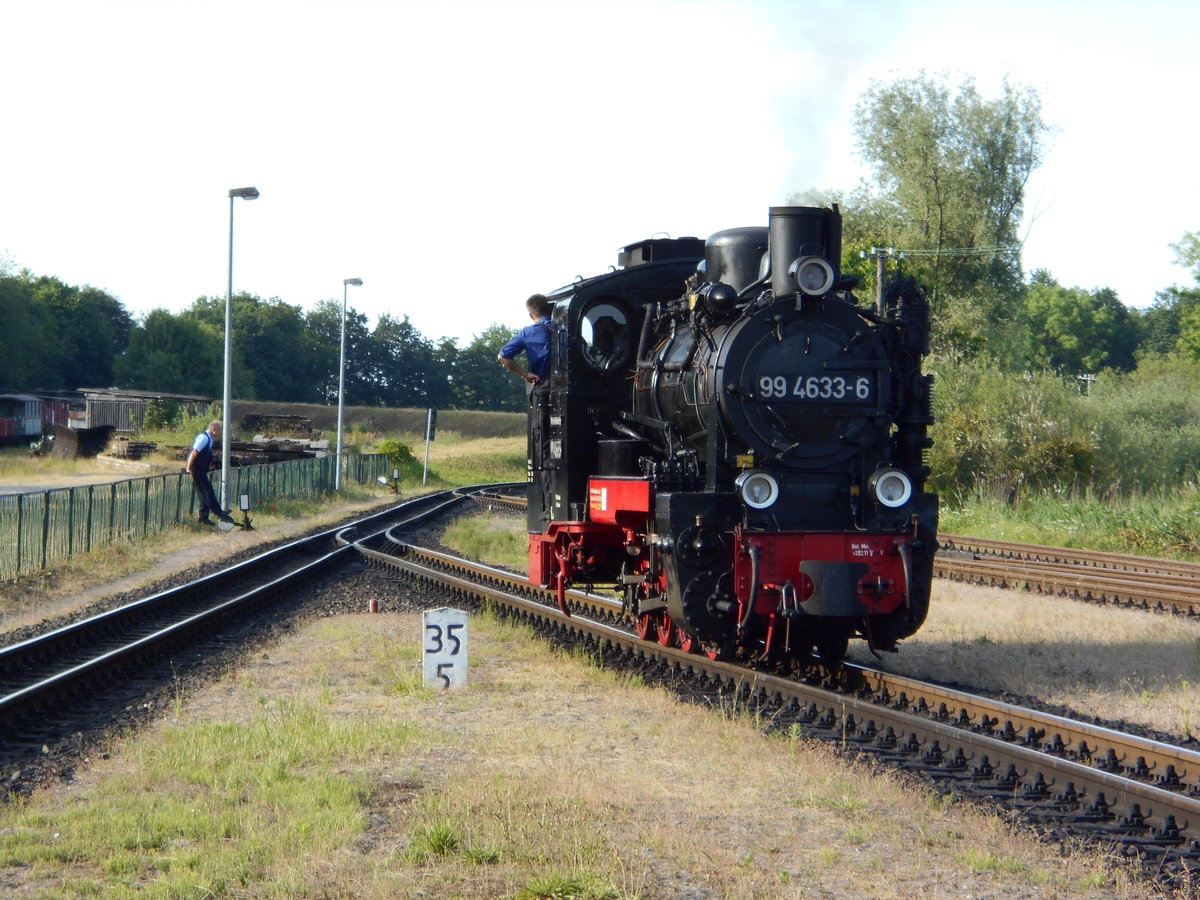 Zum Bild: 99 4802 zog den P112 durch Posewald und wird in Kürze die Endhaltestelle Putbus erreichen.