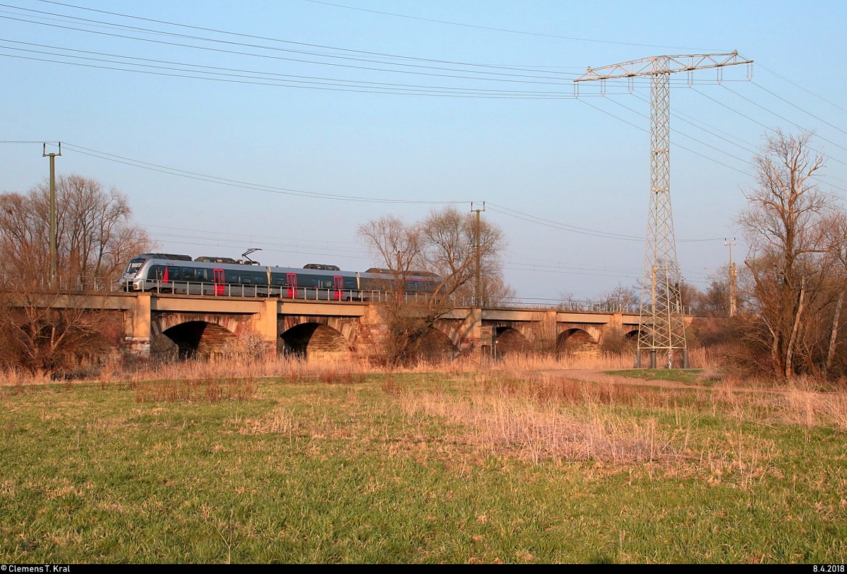 Seitlicher Blick auf 9442 ??? (Bombardier Talent 2) von Abellio Rail Mitteldeutschland als RE 74716 (RE9) von Halle(Saale)Hbf nach Kassel Hbf, der in der Saaleaue bei Angersdorf auf der Bahnstrecke Halle–Hann. Münden (KBS 590) fährt. [8.4.2018 | 19:09 Uhr]