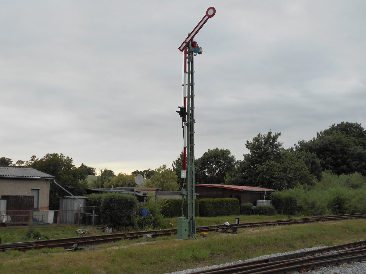 In Putbus ist wirklich wieder ein Formsignal in Betrieb gegangen.Zur Erleichterung für den Zugleiter(Fdl)braucht das Signal nicht mechanisch gezogen werden.Aufnahme am 13.Juni 2018.