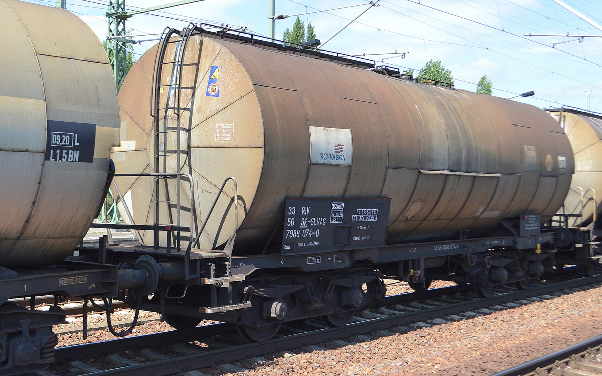 Slowakischer Kesselwagen vom Einsteller SLOVVAGON mit der Nr. 33 RIV 56 SK-SLVAG 7988 074-0 Zas in einem Ganzzug gleichartiger Kesselwagen am 12.06.18 Bf. Flughafen Berlin-Schönefeld.