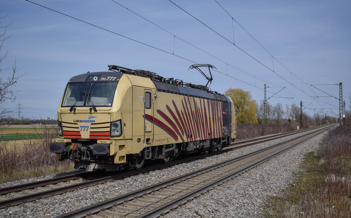 193 777 ist am 03.04.2018 Lz auf dem Weg nach Basel um den AKE Rheingold abzuholen. Hier in flotter Fahrt durch Buggingen.