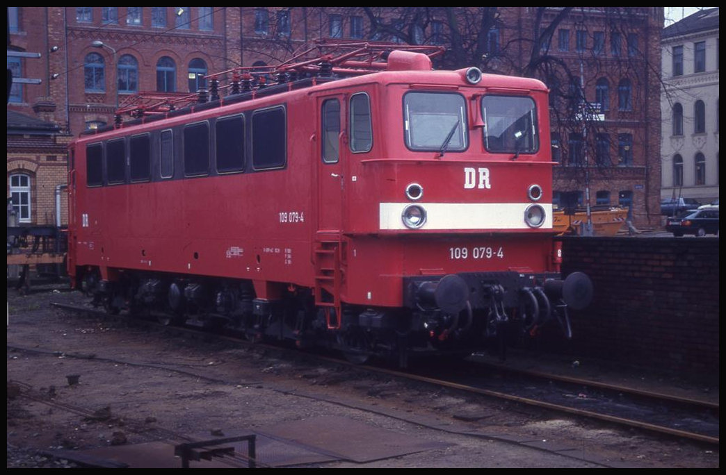 Eine der wenigen neuroten DR 109 E-Loks: DR 109079 am 5.12.1993 im BW Schwerin.