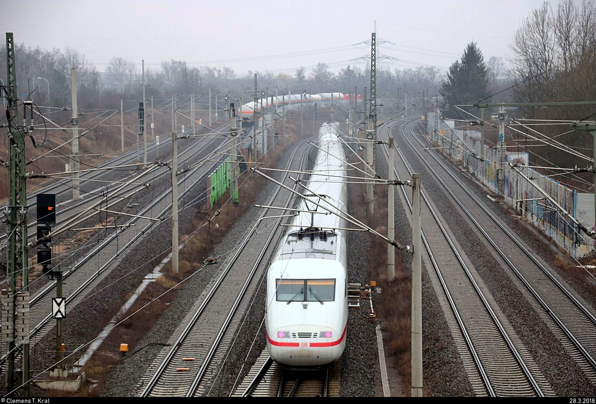 401 ??? als ICE 696 (Linie 11) von Frankfurt(Main)Hbf nach Hamburg-Altona - statt über Leipzig Hbf über Halle(Saale)Hbf - passiert den Abzweig Thüringen (At). Aufgenommen von der Brücke Dieselstraße, Halle (Saale). [28.3.2018 | 9:04 Uhr]