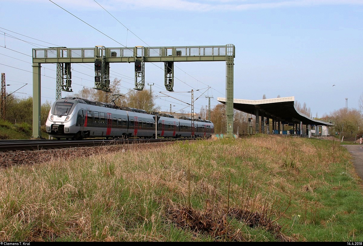 9442 108 (Bombardier Talent 2) von Abellio Rail Mitteldeutschland als RE 74724 (RE19) von Halle(Saale)Hbf Gl. 13a nach Leinefelde fährt in Halle Südstadt auf der Bahnstrecke Halle–Hann. Münden (KBS 590). [14.4.2018 | 10:09 Uhr]
