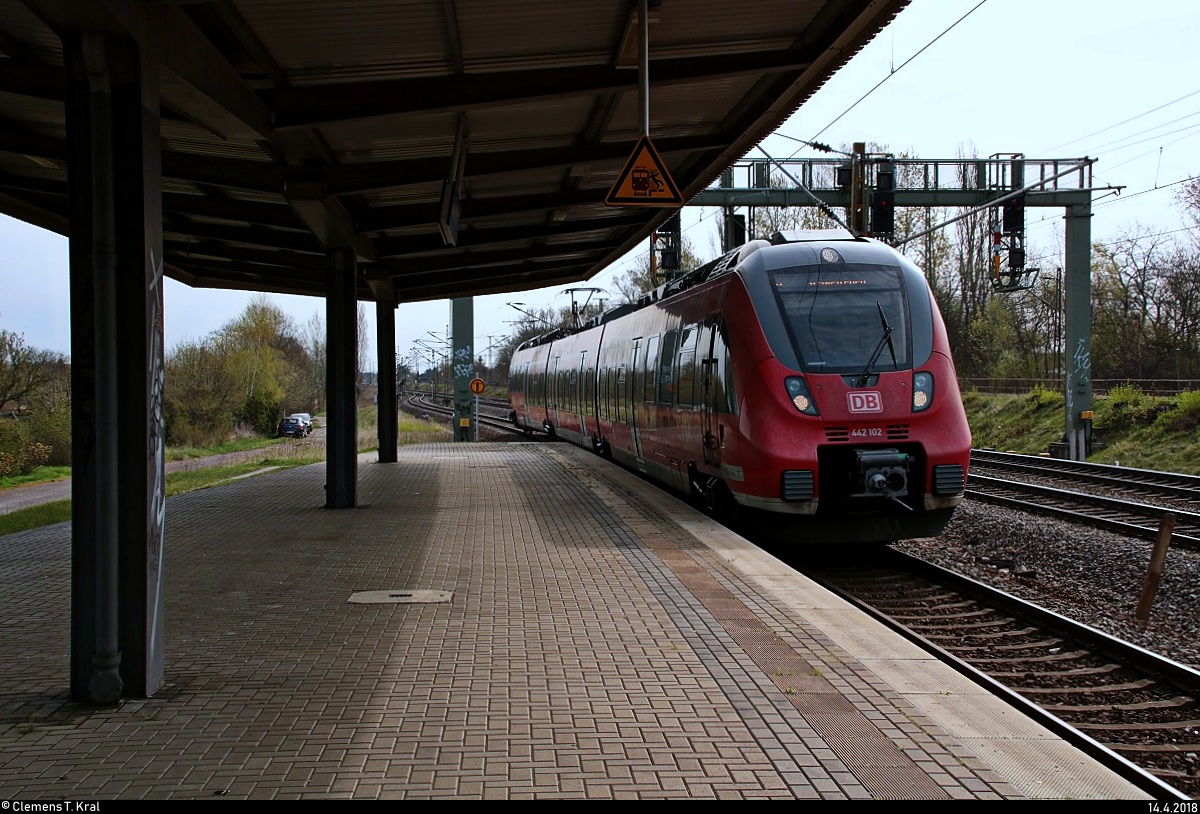 442 102 (Bombardier Talent 2) der S-Bahn Mitteldeutschland (DB Regio Südost), noch mit RSX-Beklebung, als S 37720 (S7) von Halle(Saale)Hbf Gl. 13a nach Halle-Nietleben erreicht den Hp Halle-Silberhöhe auf der Bahnstrecke Halle–Hann. Münden (KBS 590). Zeitgleich kam auch die Sonne zum Vorschein. [14.4.2018 | 9:57 Uhr]