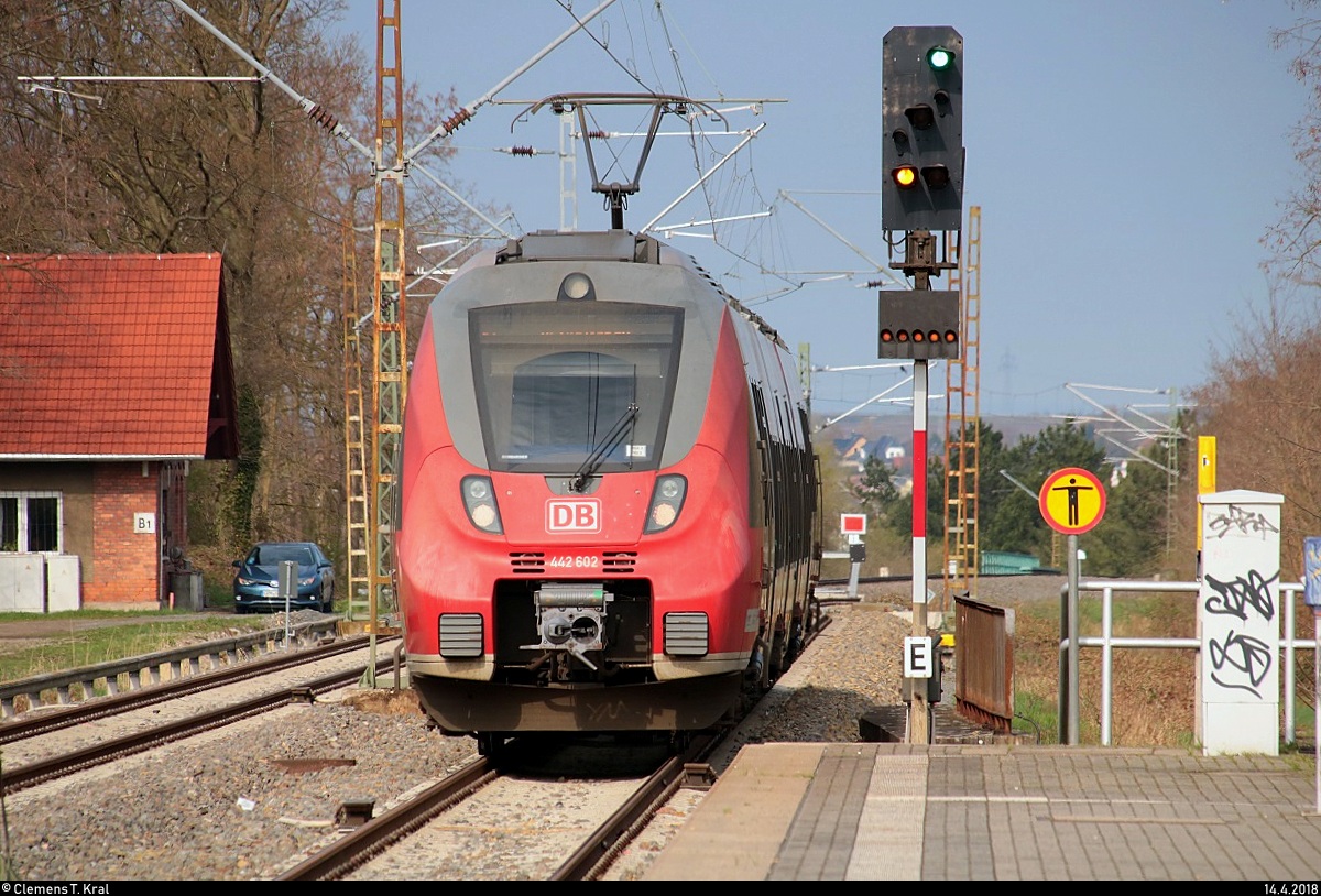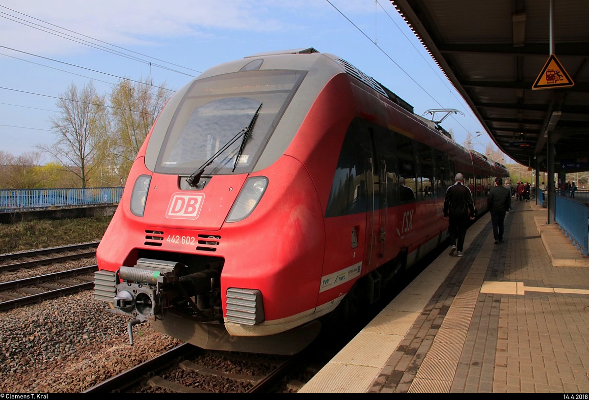 Nachschuss auf 442 602 (Bombardier Talent 2) der S-Bahn Mitteldeutschland (DB Regio Südost), noch mit RSX-Beklebung, als S 37720 (S7) von Halle(Saale)Hbf Gl. 13a nach Halle-Nietleben, die den Bahnhof Halle Südstadt auf der Bahnstrecke Halle–Hann. Münden (KBS 590) verlässt. [14.4.2018 | 10:01 Uhr]