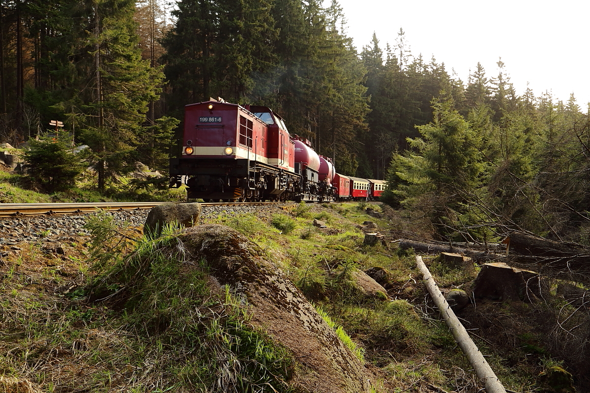 Nach dem Aussteigen der Fotografen am 21.04.2018, irgendwo zwischen Schierke und Brocken, heißt es für 199 861 mit ihrem Sonder-GmP nun wieder "Zurück, Marsch Marsch" um Anlauf für eine Scheinanfahrt zu nehmen.