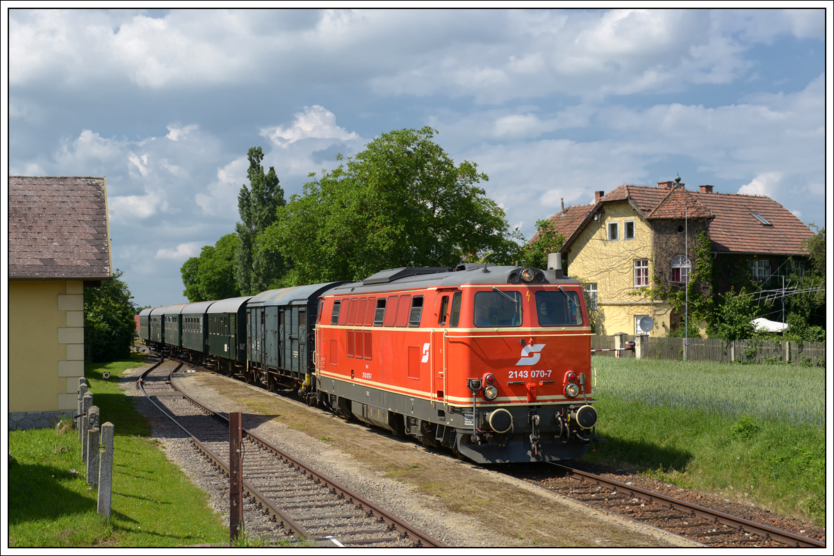 2143 70 vom Verein Neue Landesbahn mit dem Reblausexpress 16973 von Drosendorf nach Retz am 3.6.2018 bei der Durchfahrt in Zissersdorf.