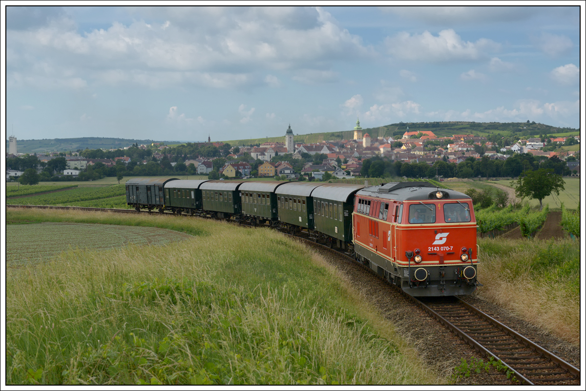 2143 70 vom Verein Neue Landesbahn mit dem letzten Reblausexpress 16974 am 3.6.18 auf der Fahrt nach Drosendorf mit Blick auf Retz. Diese herrliche Stelle geht eigentlich nie ideallichtig, da der letzte Zug des Reblausexpress Retz zu früh für ein optimales Foto verlässt. Optimal wäre das Licht um die Sonnenwende und kurz vor Sonnenuntergang.
