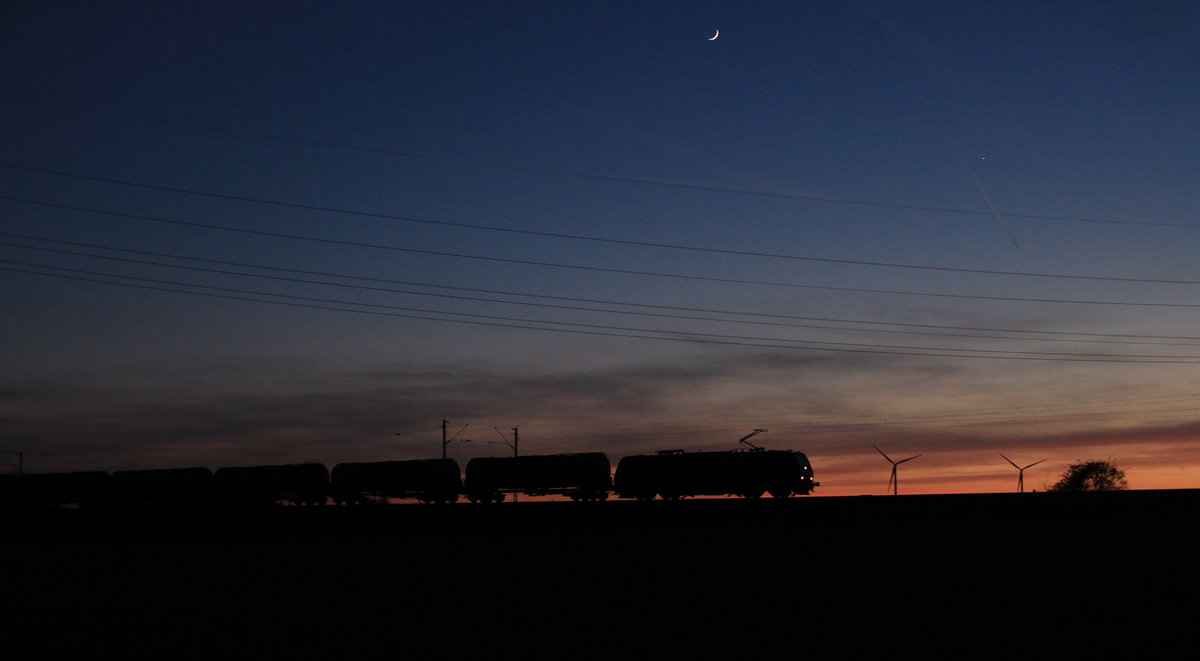 Eine BR185 zieht ihren Kesselzug aus dem abendlichen Aachen-Richterich in Richtung Osten