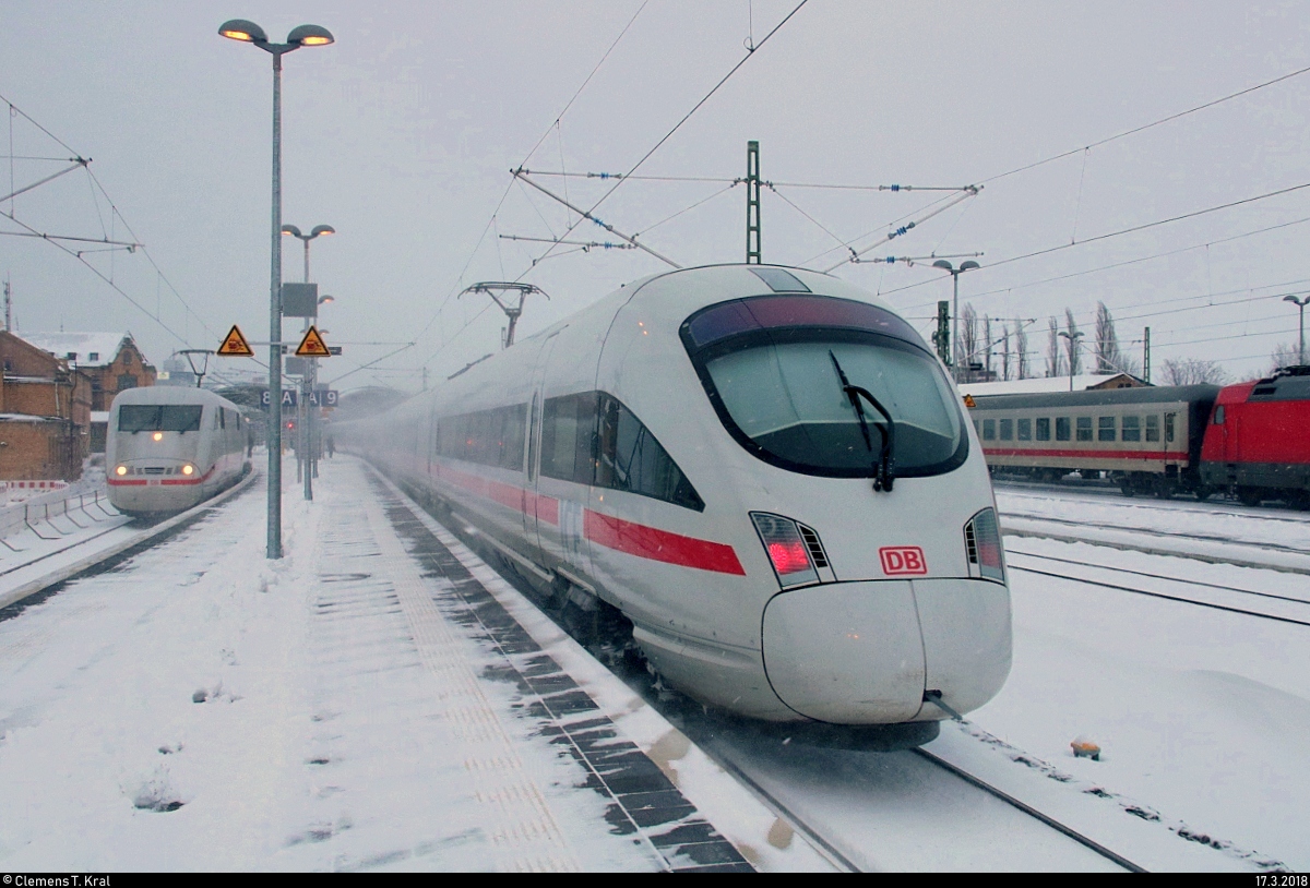 Nachschuss auf 411 262-9 (Tz 1162 "Vaihingen an der Enz") als verspäteter ICE 1631 (Linie 15) von Frankfurt(Main)Hbf nach Berlin Gesundbrunnen, der Halle(Saale)Hbf abweichend auf Gleis 9 erreicht. [17.3.2018 | 17:52 Uhr]