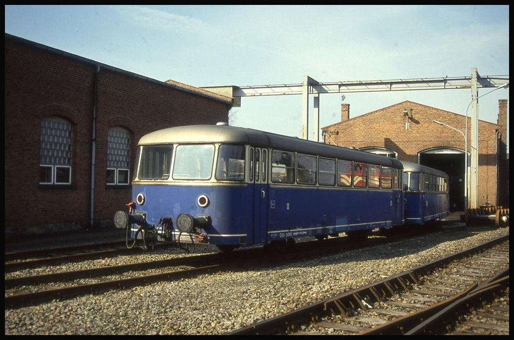ÖBB Schienenbus 6581 053 und 001 sind hier am 11.3.1994 für diverse Umarbeiten vor der Werkstatt in Lengerich Hohne zu sehen.