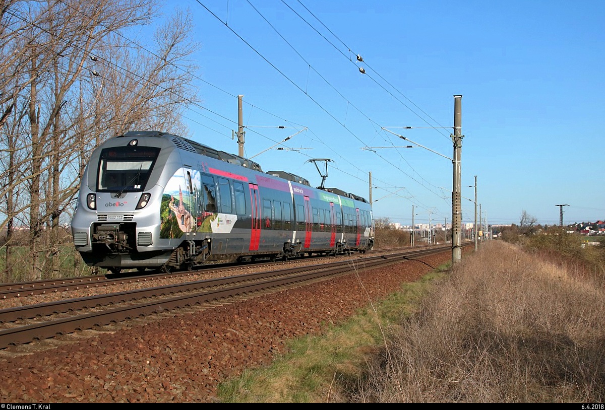 9442 112 (Bombardier Talent 2) von Abellio Rail Mitteldeutschland mit Seitenwerbung als RB 74786 (RB75) von Halle(Saale)Hbf nach Lutherstadt Eisleben fährt in Zscherben, Gartenweg, auf der Bahnstrecke Halle–Hann. Münden (KBS 590). [6.4.2018 | 17:49 Uhr]
