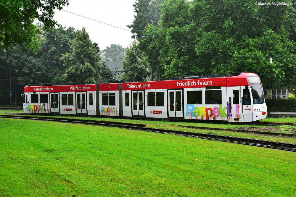 Niederflurwagen 4527 wurde für die  Respekt -Kampagne gestaltet. Hier zu sehen kurz vor der Haltestelle Moltkestraße am 08.06.2018.