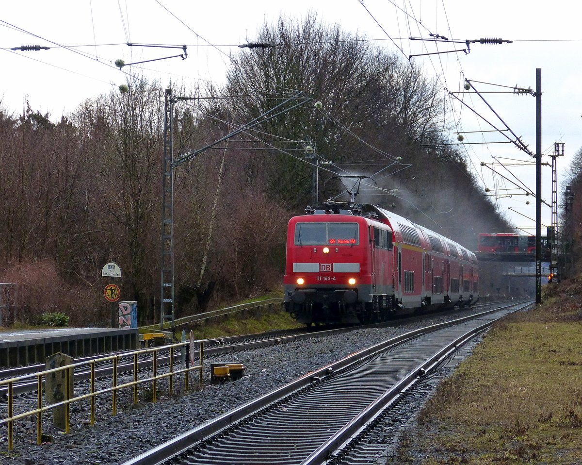 111 143-4 DB kommt die Kohlscheider-Rampe hoch aus Richtung Neuss,Herzogenrath mit mit dem RE4 aus Dortmund-Hbf nach Aachen-Hbf und fährt durch Kohlscheid in Richtung Richterich,Laurensberg,Aachen-West,Aachen-Schanz,Aachen-Hbf.