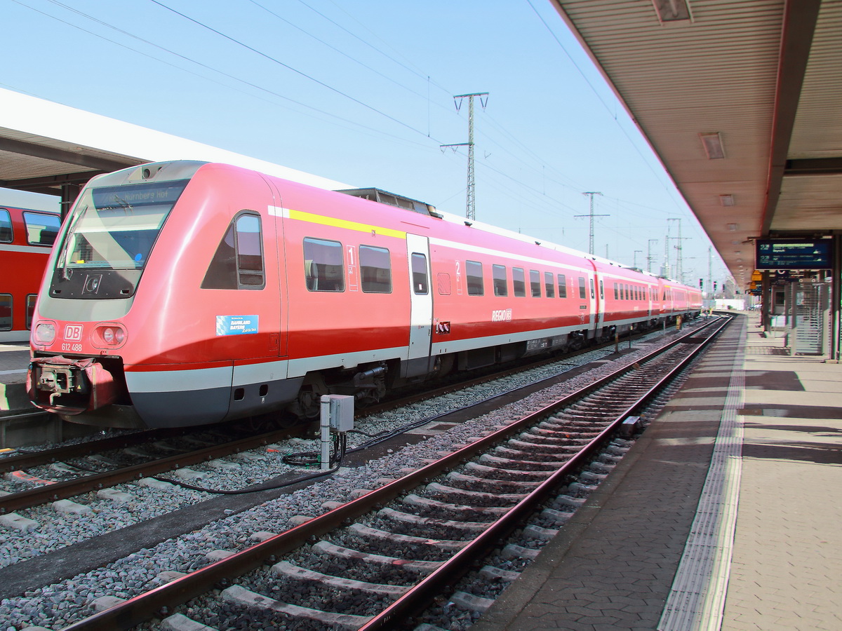 Nürnberg Hauptbahnhof am 22. Februar 2018, auf Gleis 20 steht 612 488 mit einem RE aus Schwandorf.
