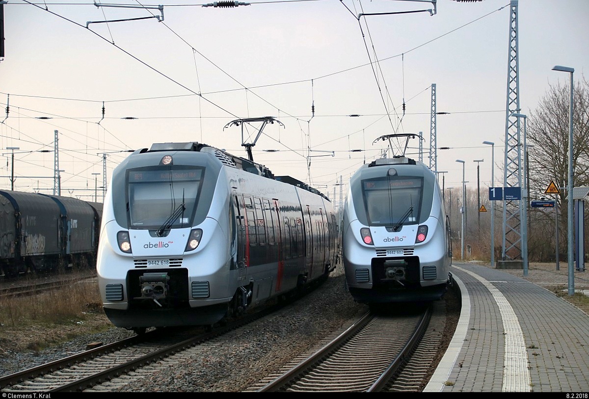 9442 618 (Bombardier Talent 2) von Abellio Rail Mitteldeutschland als RE 74711 (RE9) von Kassel-Wilhelmshöhe nach Halle(Saale)Hbf Gl. 13a trifft auf 9442 102 als RB 74780 (RB75) von Halle(Saale)Hbf nach Sangerhausen im Bahnhof Angersdorf auf der Bahnstrecke Halle–Hann. Münden (KBS 590). [8.2.2018 | 14:49 Uhr]