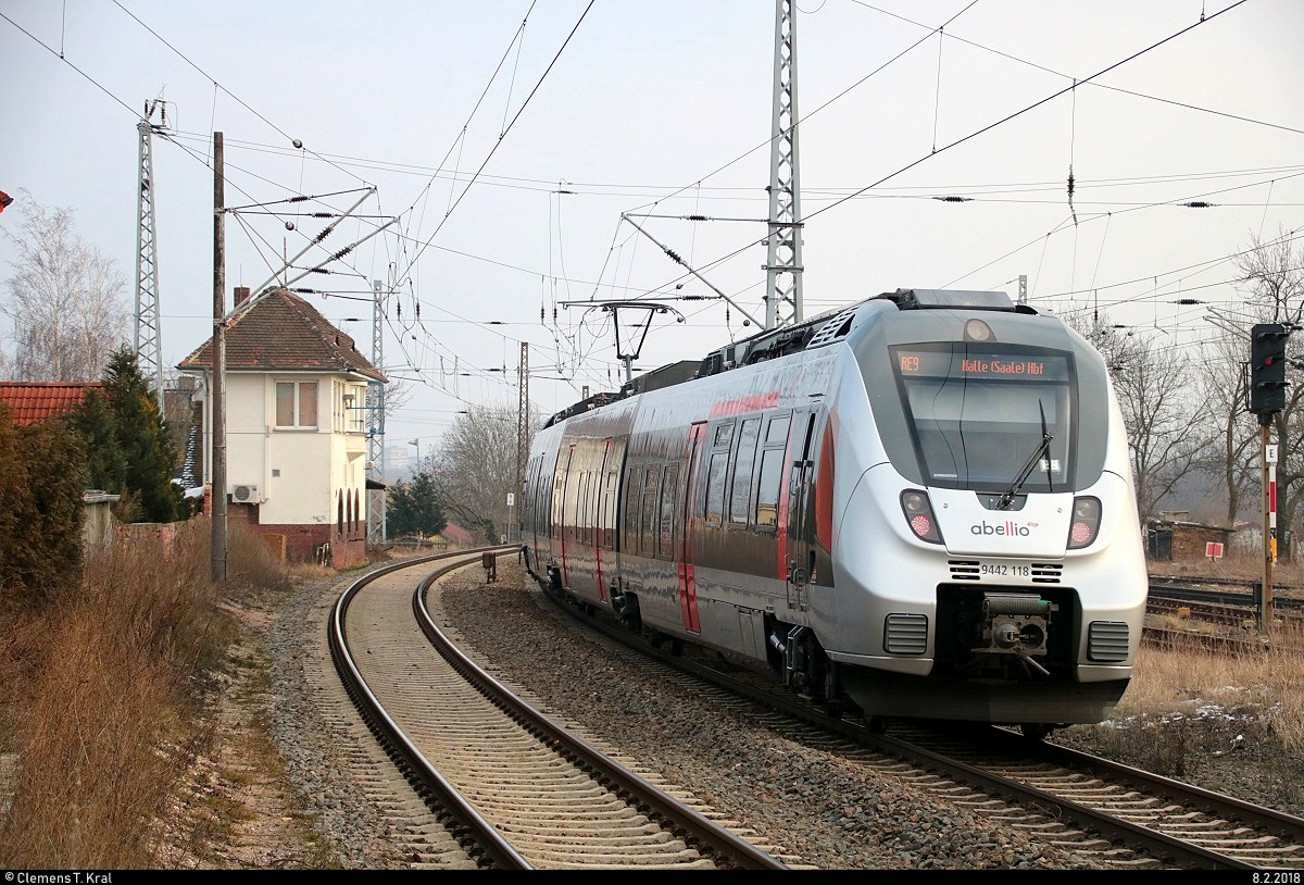 Nachschuss auf 9442 118 (Bombardier Talent 2) von Abellio Rail Mitteldeutschland als RE 74711 (RE9) von Kassel-Wilhelmshöhe nach Halle(Saale)Hbf Gl. 13a, der den Bahnhof Angersdorf auf der Bahnstrecke Halle–Hann. Münden (KBS 590) durchfährt. [8.2.2018 | 14:49 Uhr]