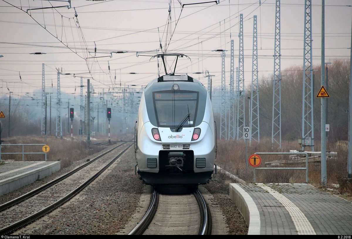 Tele-Nachschuss auf 9442 107 (Bombardier Talent 2) von Abellio Rail Mitteldeutschland als RE 74712 (RE9) von Halle(Saale)Hbf nach Kassel-Wilhelmshöhe, der den Bahnhof Angersdorf auf der Bahnstrecke Halle–Hann. Münden (KBS 590) durchfährt. [8.2.2018 | 15:08 Uhr]