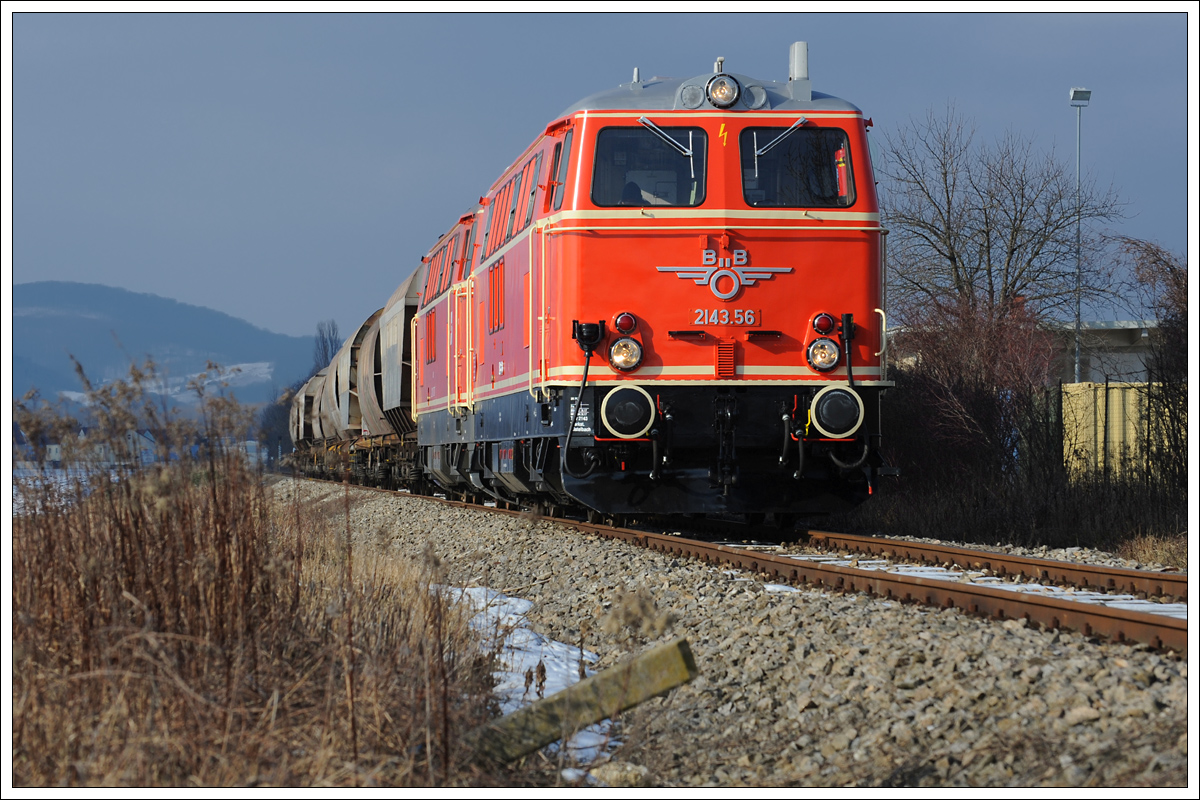2143.56 und 2143 070 vom Verein Neue Landesbahn am 25.2.2018 mit einem leeren Getreidezug von Korneuburg nach Ernstbrunn unterwegs, aufgenommen bei der Kaserne Korneuburg.