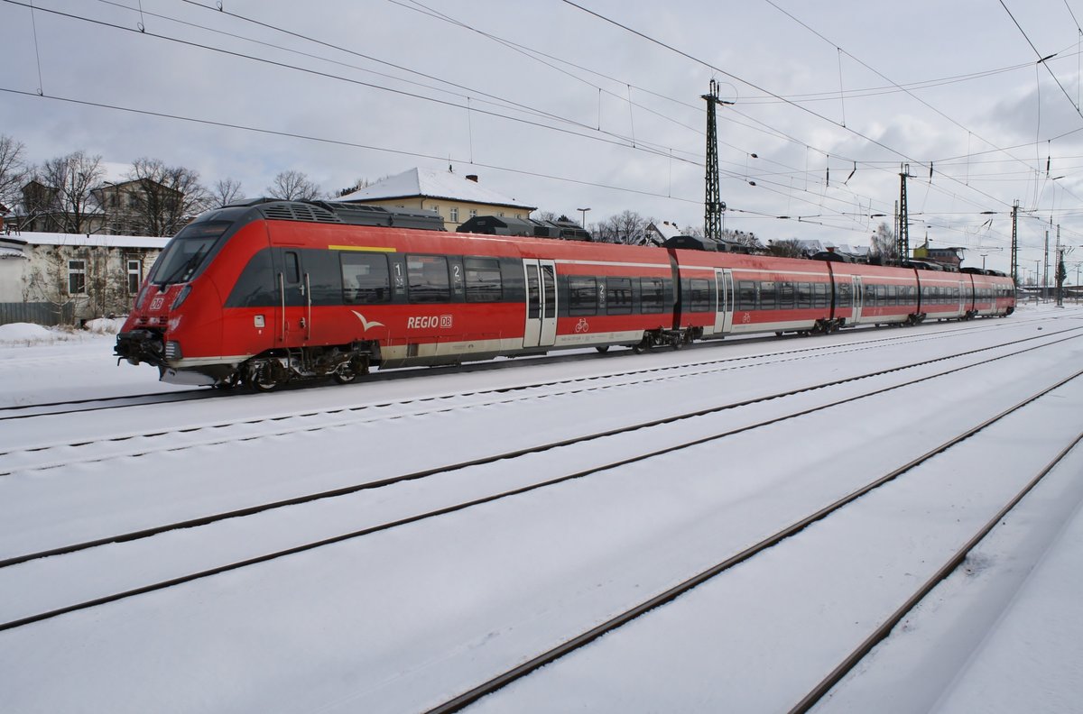 1442 611 und 1442 614 (Bombardier Talent 2) der S-Bahn Mitteldeutschland (DB Regio Südost) als S 37322 (S3) von Leipzig-Connewitz nach Halle(Saale)Hbf fahren bei Kanena-Bruckdorf auf der Bahnstrecke Magdeburg–Leipzig (KBS 340). [4.2.2018 | 10:04 Uhr]
