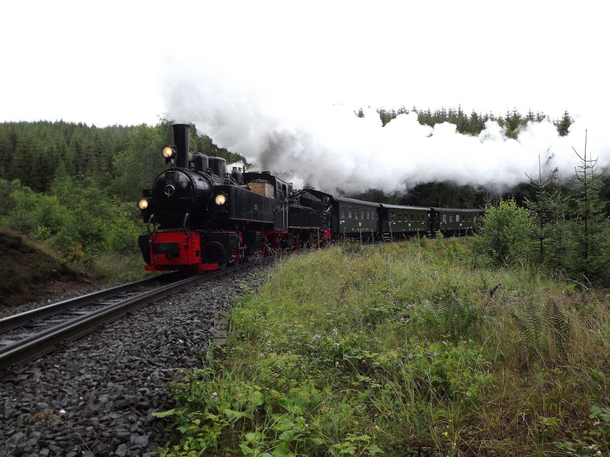 Etwa 1 km vor Elend kommt unser Sonderzug auf dem Weg nach Benneckenstein aus dem Wormketal gedampft, um gleich recht steil ins Tal der Kalten Bode nach Elend zu rollen.