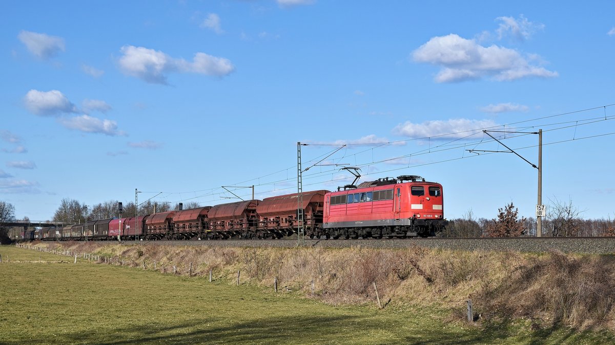 Die an DB Cargo vermietete Railpool 151 109 (ex DB), ist mit einem gemischtem Güterzug am 20.03.18 in Hüde in Richtung Osnabrück unterwegs.