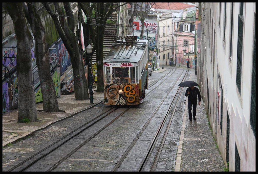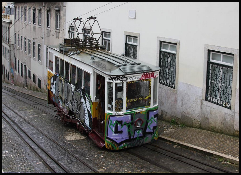 Kunst, kommt von Können, wird oft gesagt. Wenn man es aber nicht kann und nur rum schmieren will, sollte man sich besser als Pflastermaler versuchen! - Schade, wie sich hier an der Bergstation in der Taberna da Gloria einer der Triebwagen am 19.3.2018 in Lissabon präsentieren muss.