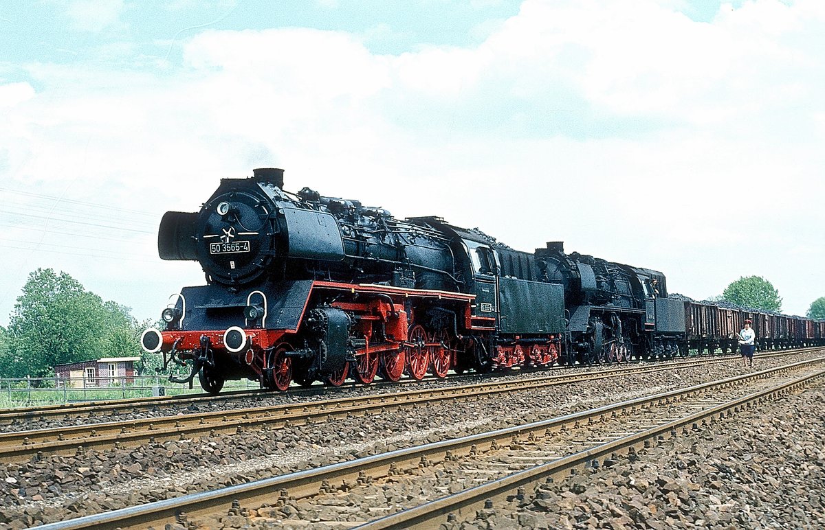 So würde man auf der Modellbahn keinen Nahverkehrszug zusammenstellen. In Natura war es aber am 29.4.1993 der Fall. 120130 war hier an der Landesgrenze zwischen Niedersachsen und Nordrhein Westfalen bei Natrup Hagen mit dem E 3368 nach Münster unterwegs. Eigentlich waren die Silberlinge die Standardwagen. Bei dieser Tour hatte der Zug aber eine hochwertige Aufwertung durch die Beigabe bzw. Überführung von IC Wagen erfahren.
